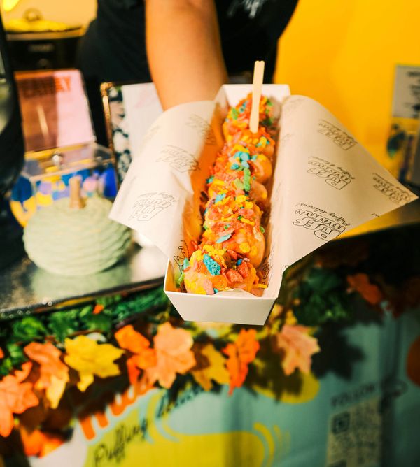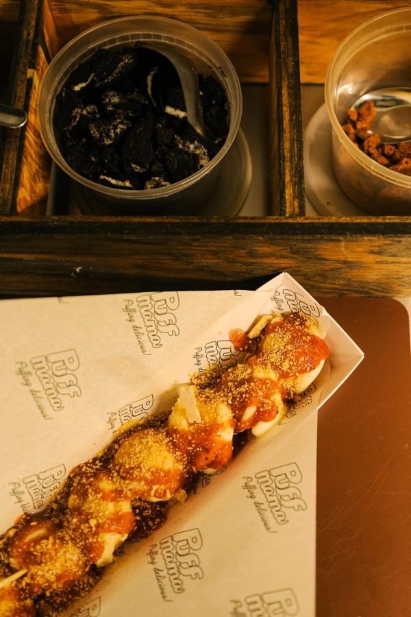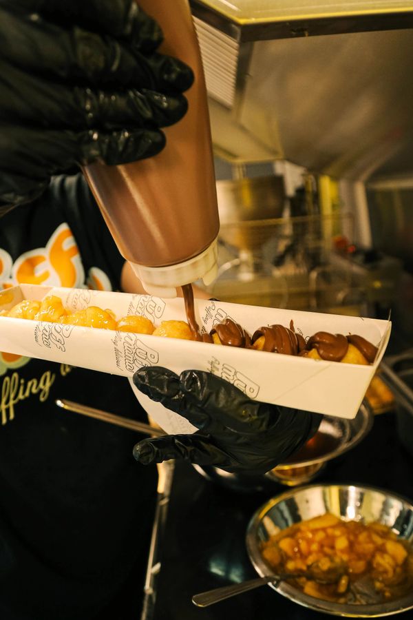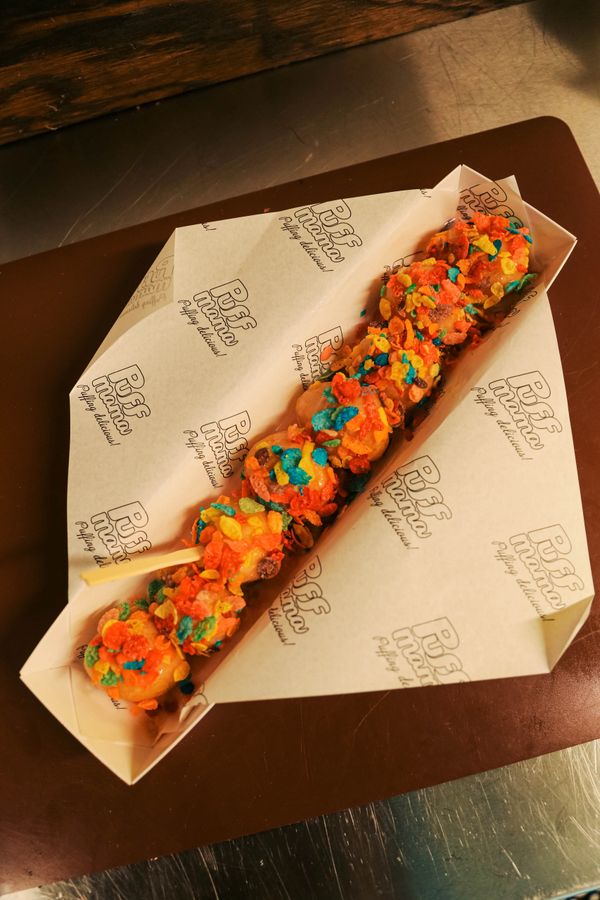 First, your puffs are glazed in honey, cinnamon syrup. Then we add the toppings to make it an experience...check back often for additions and changes. These are some of the fan favs!